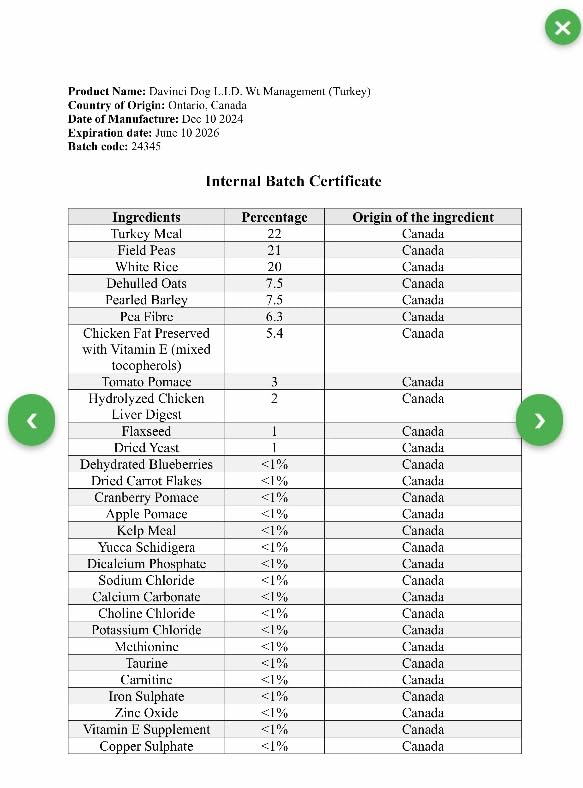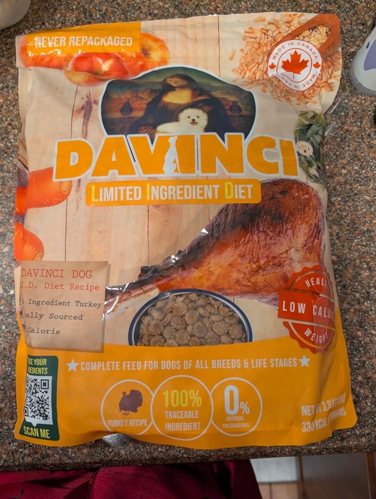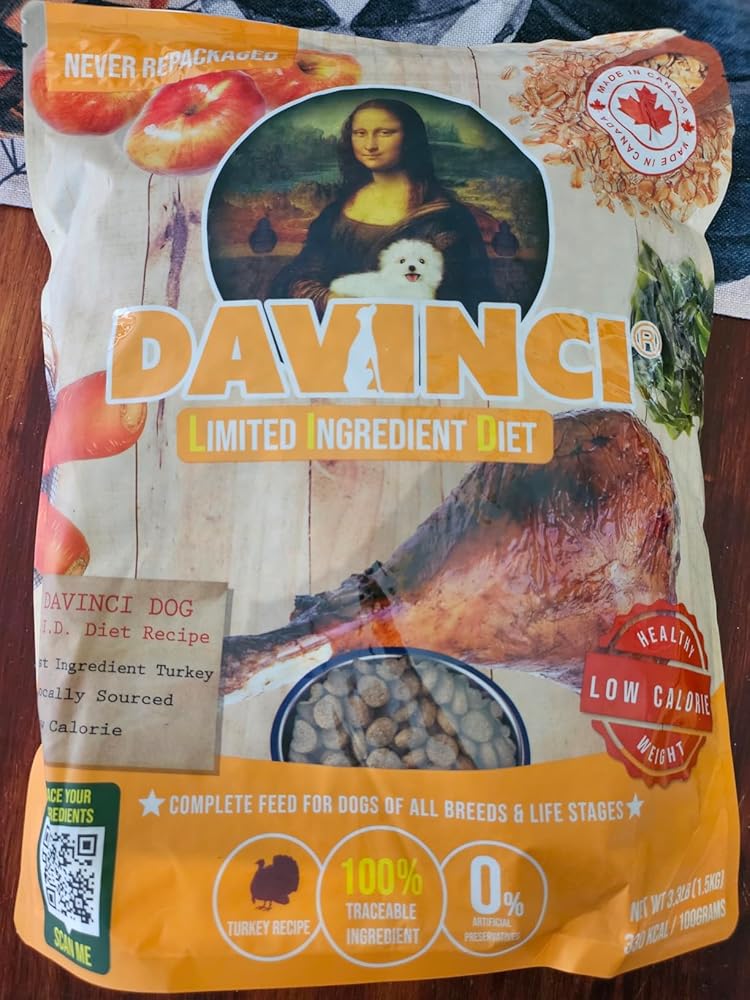 I feed my little dog, Zoe, a raw diet as her main meal, but I always keep a bowl of kibble available in case she gets hungry. It is essential to me that anything Zoe eats is healthy, free of unnecessary additives and chemicals, as we want her to live a long, healthy life.Zoe has never been a huge fan of kibble; the bowl usually sits untouched for days. However, she seems to prefer this Davinci Dog LID Turkey Recipe over the kibble I previously bought at the pet store. In fact, since I started using the Davinci Dog LID Turkey Recipe a week ago, I've noticed her kibble bowl has been empty three times. This is quite unusual, considering she is still eating her regular raw food diet.I appreciate that this kibble uses 100% Canadian-Sourced Ingredients and has a limited ingredient list. The ingredients are healthy and, apparently, quite tasty! It is definitely "Zoe Approved"!