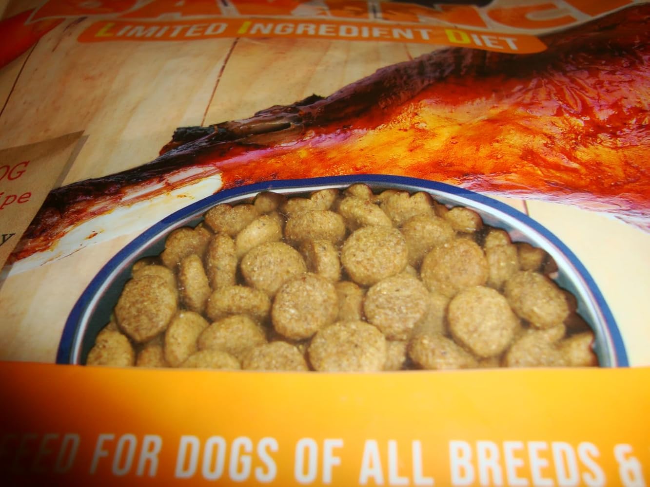 Our 2 large pups took to this food right away. Way more than one ingredient but at least it did not make our dogs sick. Love the look of the bag and there is actually quite a bit in here for the size. In my head, I had it that it was a trial size and was surprised when I opened and saw a large bag.Small, hard and light brown pellets, I put 2 small handfuls mixed in with their cooked food just to see how they did. They lapped this up and then pathetically whined for more. It was so pathetically adorable! One of my favorite features is that this bag of food does not stink once opened. Does it smell delicious like a steak, no. But it does not reek either and that is huge for me.If needs be, I would totally get this again if offered.