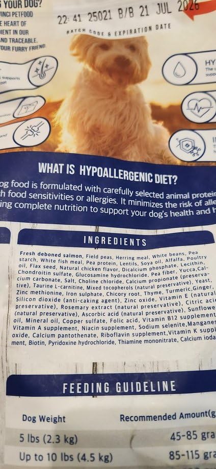 Davinci Dog 100°C Hypoallergenic is a grain-free, fish-based recipe designed for dogs with food sensitivities, itchy skin, or soft stools. It avoids high-allergen meats like beef or lamb and includes ocean-sourced fish proteins with only a trace of natural chicken flavor. Combined with selected legumes and no grains, it’s suitable for many dogs with mild to moderate food allergies.