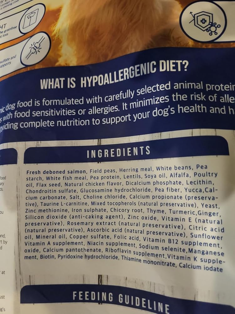 Our formula starts with real fresh deboned salmon and includes a blend of ocean-based proteins like herring and white fish. We avoid common allergens like beef, dairy, and grains. By baking at a low temperature (100°C), we preserve sensitive nutrients like omega-3s and natural antioxidants, resulting in improved digestibility and nutritional integrity. Functional additives like L-carnitine, glucosamine, turmeric, and chicory root further support joint, gut, and metabolic health.
